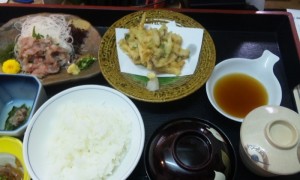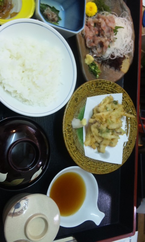 白身魚の竜田揚げ野菜あんかけとイカ刺し