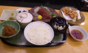 白身魚の竜田揚げ野菜あんかけとイカ刺し
