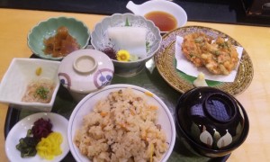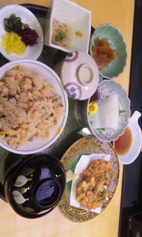 炊き込みご飯に、桜海老のかき揚といか刺が付いた
