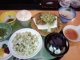 高菜めしと舞茸と根三つ葉のかき揚げとイカ刺!